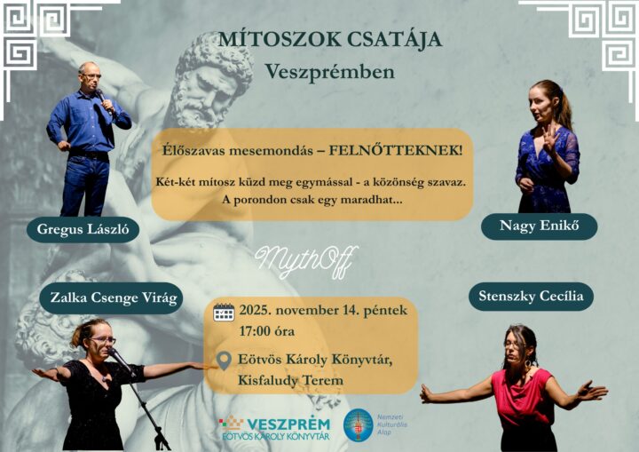 2025. november 14. péntek – 17:00 óra Mesemondók: Gregus László, Nagy Enikő, Stenszky Cecília, Zalka Csenge VirágHelyszín: Eötvös Károly Könyvtár, Kisfaludy terem Két-két mítosz küzd